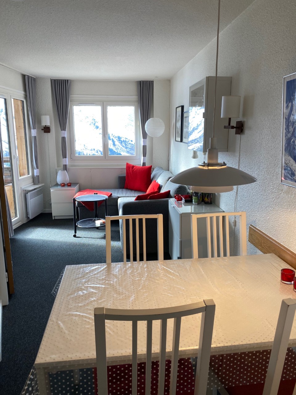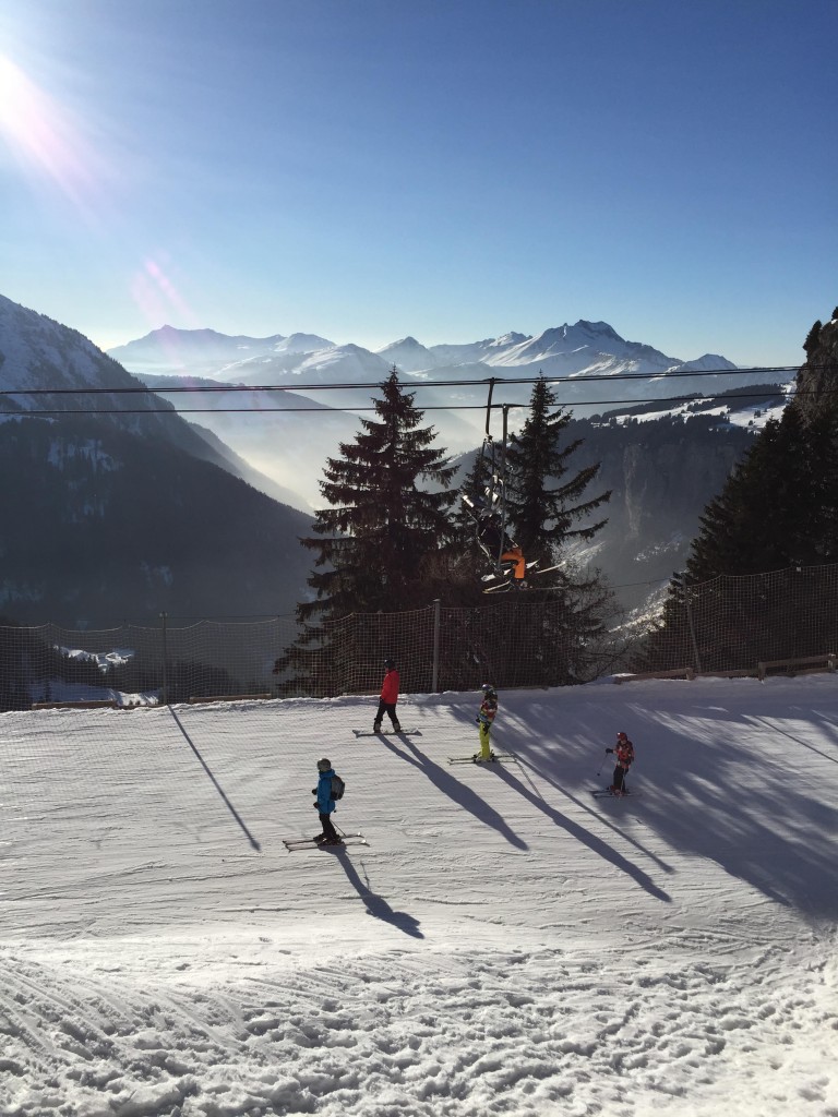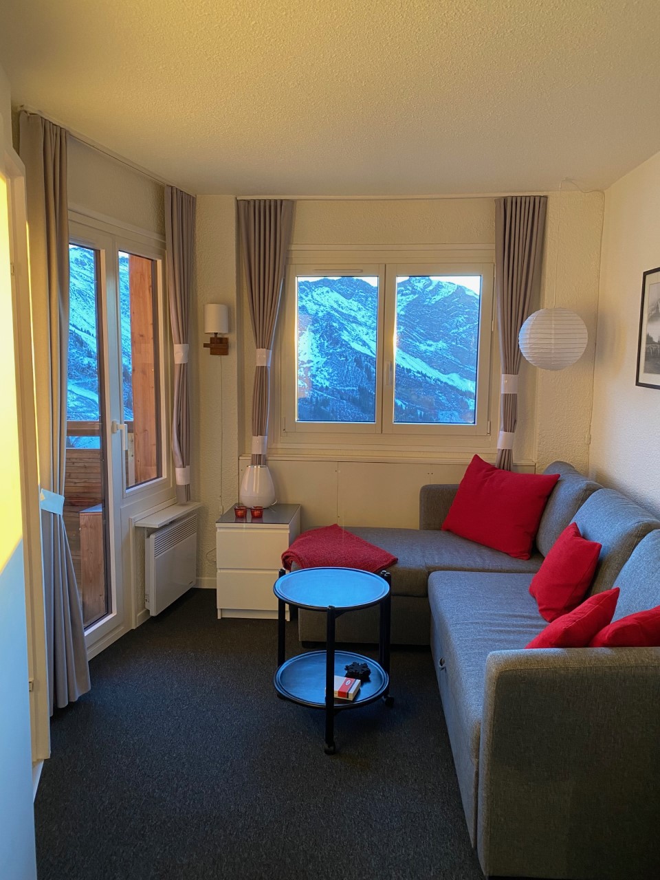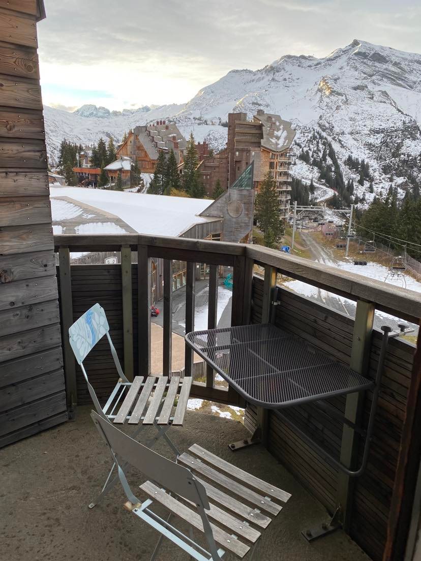 Fra den sydvestvendte altan har man en flot panoramaudsigt over bjergene og Morzinedalen samt byens Le Corbusier inspirerede arkitektur. På 2. etage, ligger vores skirum, skab nr. 72, hvorfra der er direkte adgang til pisterne.